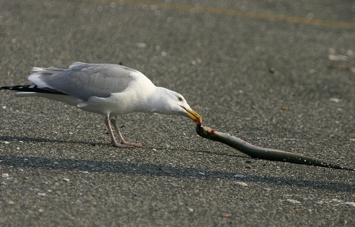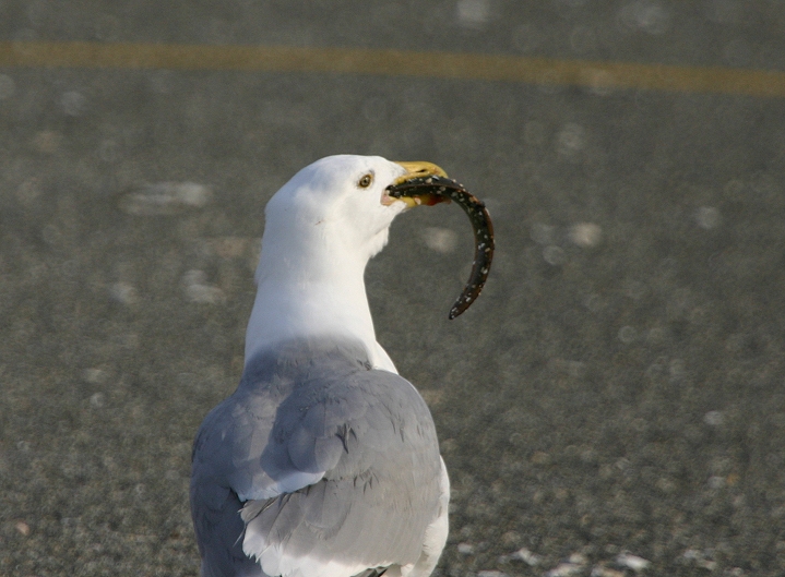 We drove up just as this Herring Gull pulled a feast of American Eel (~24"; female based on location and size)