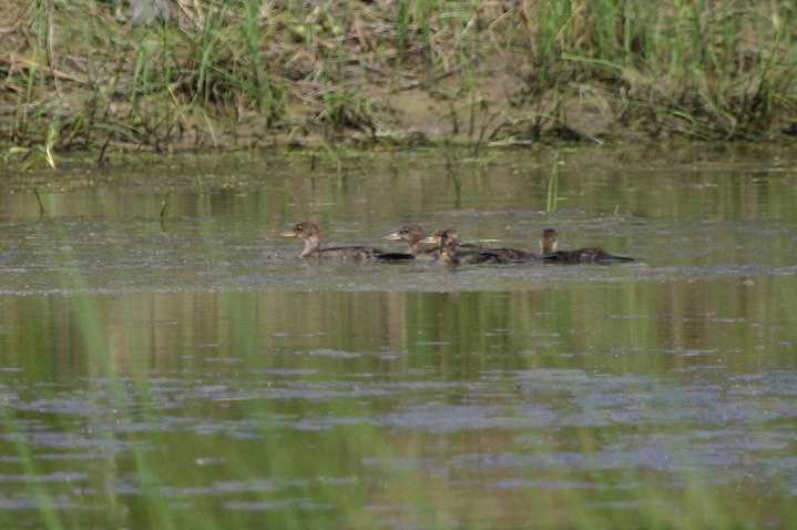 Below three: OK, cuteness warning... Recently hatched Hooded Mergansers race to their mother's protection as we approach a quiet pond in Frederick Co., Maryland (4/22/2007).