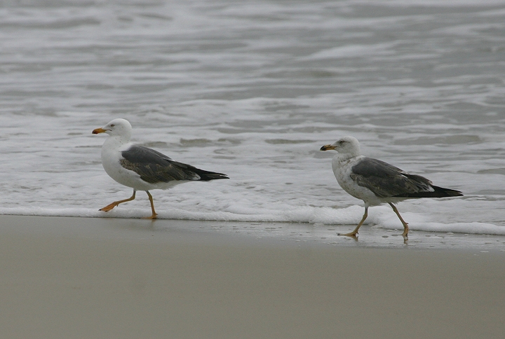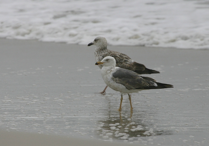 Below two: Perhaps the strangest near-adult Lesser Black-backed Gull I've seen. It might fall somewhere within the expected range of variability for a bird going into its third winter, but I've never seen this combination of field marks before. In second image, it is seen with a very different third-winter Lesser Black-backed Gull (Assateague Island, Maryland, 11/16/2008).