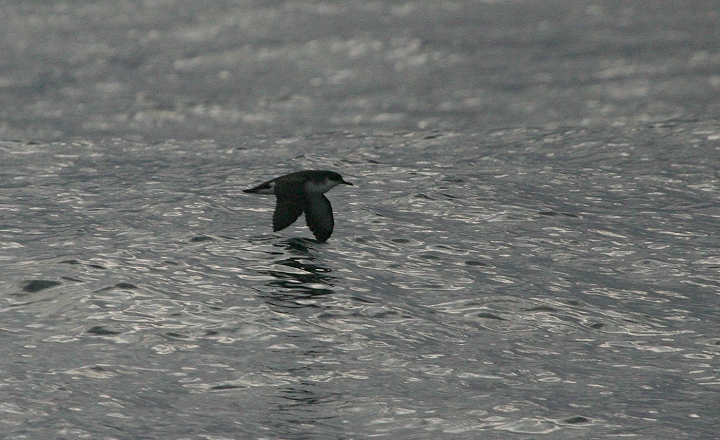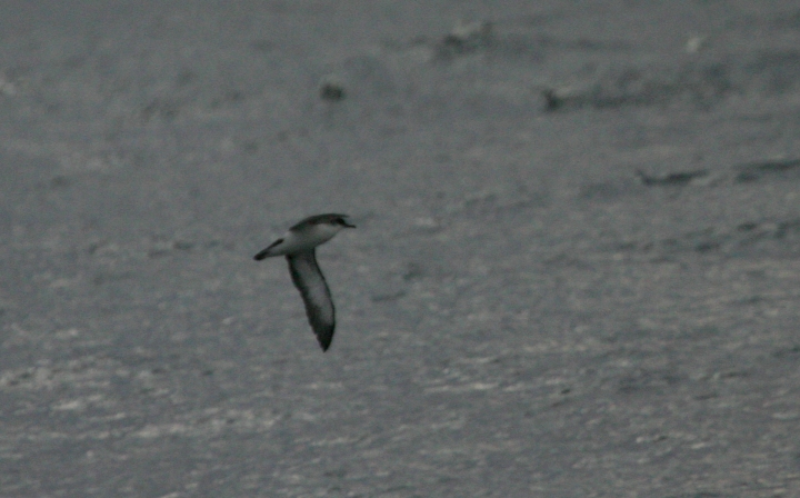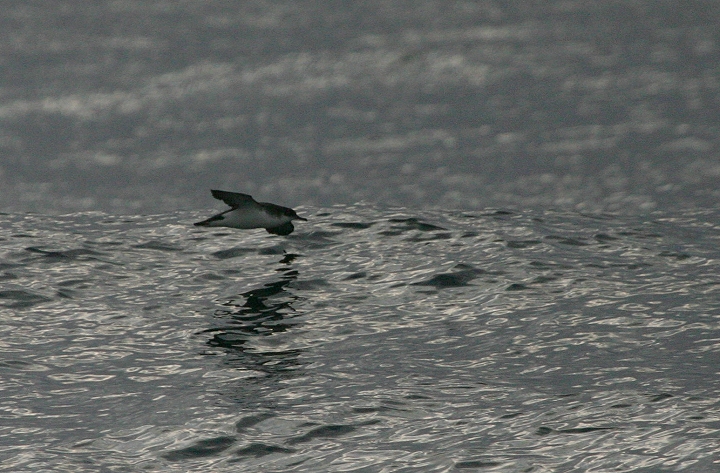 Below: A distant Manx Shearwater in Delaware waters on 12/11/2004 pelagic out of Lewes. These are poor shots, but were the best that light conditions and the deathly extent of my seasickness allowed at the time! The Manx Shearwater is seen annually off the Mid-Atlantic coast in migration, but is always a good sighting. Quite similar to the smaller Audubon's Shearwater (our smallest; see Audubon's Shearwater page), the Manx Shearwater is still small, but has proportions closer to the larger shearwaters (Sibley). Manx also prefers cold water, while the Audubon's prefers warm. Note this bird's white undertail coverts and dark auriculars (cheeks) with pale crescent behind.