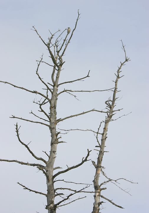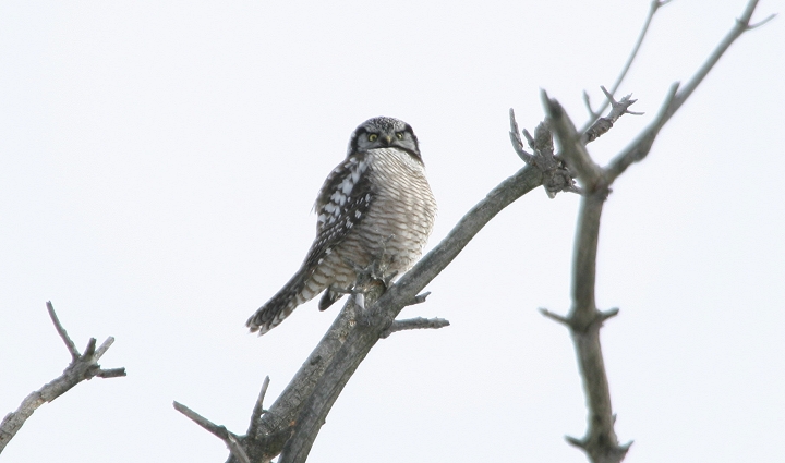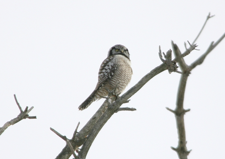 Comments: This beautiful owl of the northern boreal forests is quite an evolutionary curiosity: a long-tailed hawklike owl that hunts primarily by day. It is most often seen perched high atop a tree, as shown in the bottom photo, from which it hunts birds and small mammals. It will take prey as large as snowshoe hares and ptarmigans. I photographed this amazing bird north of the Ottawa River in Quebec, Canada.