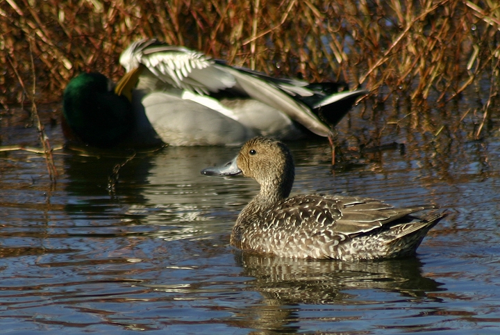 Below: A tipped-up hen Northern Pintail (right) feeding at Blackwater NWR, Dorchester Co., Maryland (2/10/2008). The bird on the left is a drake Northern Shoveler.