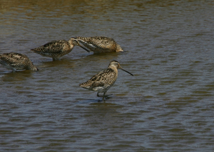Below three: Short-billed Dowitchers foraging at Blackwater NWR, Dorchester Co., Maryland (7/29/2007). First image shows the Prairie subspecies, L. griseus hendersoni, while the second image shows the Atlantic subspecies, L. griseus griseus. In the third image, the hendersoni is on the right.