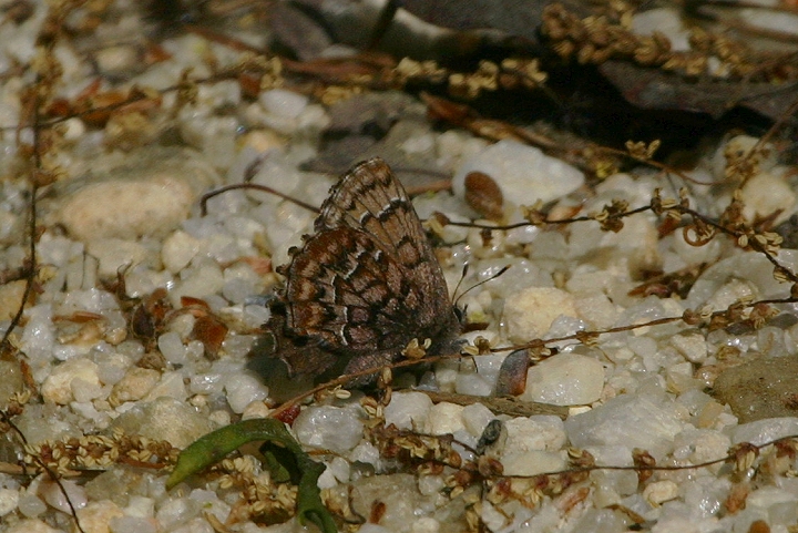 "Stunningly banded with rich reddish brown and black, the Eastern Pine Elfin can be mistaken for no other butterfly in our area... Most common in pine barrens, this elfin can also be found in deciduous woodlands with groves of White Pine" (Butterflies through Binoculars). Note the interesting variations between the two above photos, which were both taken at Elk Neck State Park, Cecil County, Maryland (5/7/2005).