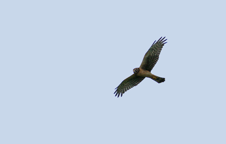 Below two: A fairly early migrant Northern Harrier. The characteristic shape of migrant harriers can be noted even at a distance. The dark head combined with an orange, unstreaked chest mark this bird as an immature. From above, a pale bar can be seen in the wings, and of course the white rump is always obvious. Photographed in P.G. Co., Maryland (9/14/2007).