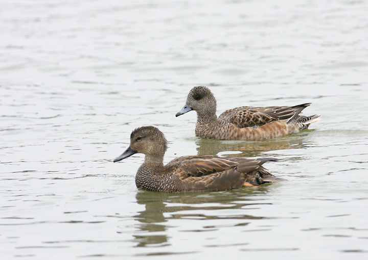 Below: A very differently plumaged drake Gadwall (front) and hen American Wigeon (back) in Worcester Co., Maryland (12/9/2007). This image illustrates nicely how easy it is to not pay enough attention to less common plumages of our common ducks. I immediately called this bird a Gadwall based on structure, but on thorough review found some details unfamiliar enough that I began wondering if it might be a hybrid (e.g., Gadwall x American Wigeon). Calling on the experts, a strong majority called this bird a young male molting into its first-winter plumage. Thanks to everyone who commented.